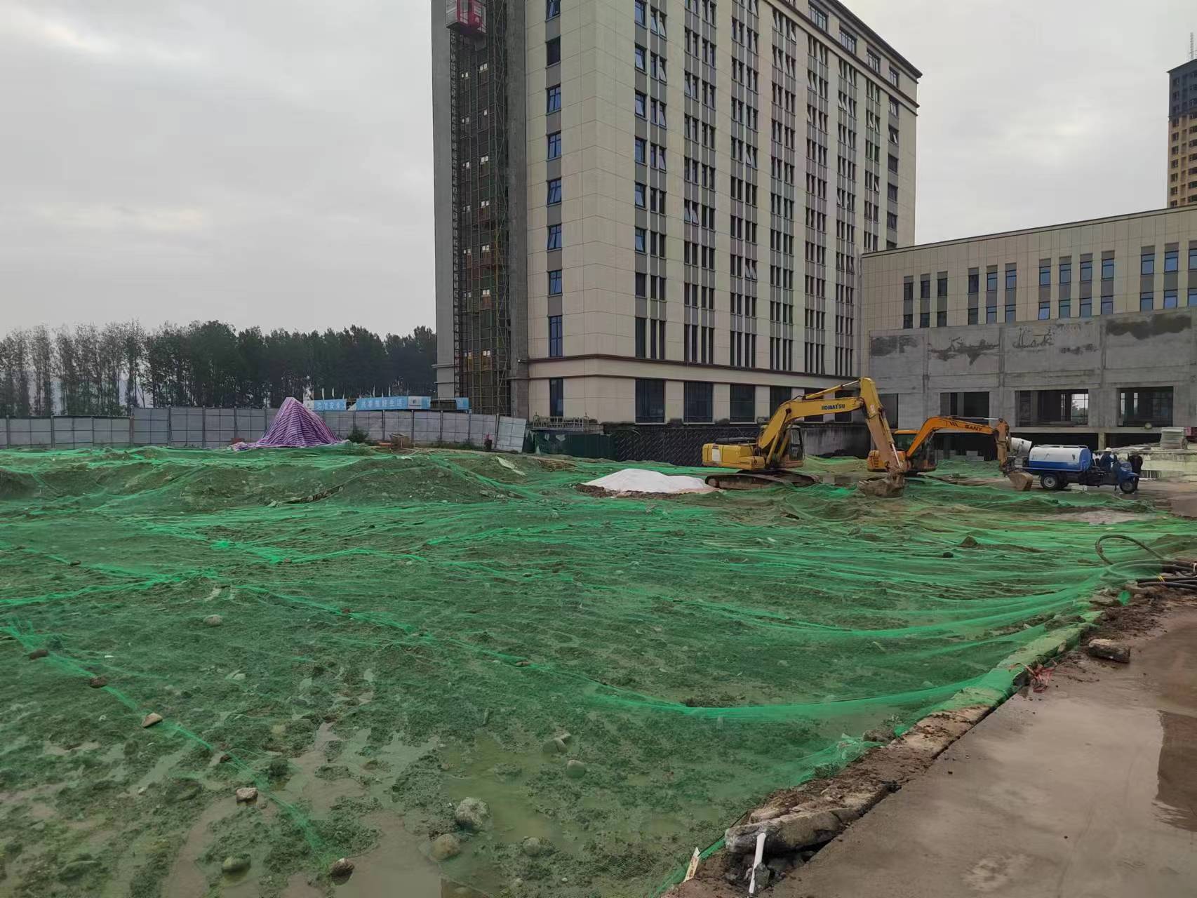 已完成道路硬化、室外雨水收集井。正在进行室外给水及消防管网安装。